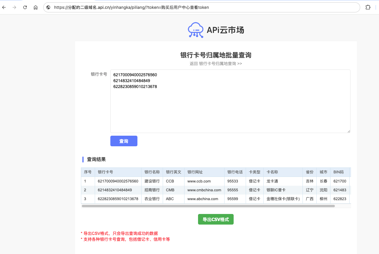接口地址:http(s)://分配的二级域名/yinhangka/piliang/
